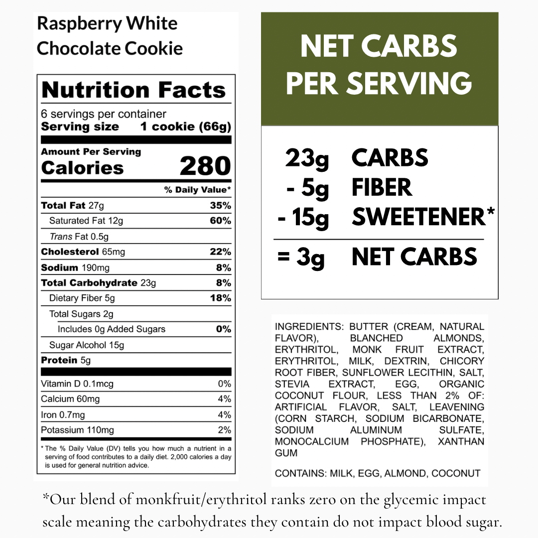 Indulge in the perfect balance of tart and sweet with our Raspberry White Chocolate Chip Cookie—a keto-friendly, no sugar added treat crafted for pure decadence. Each bite delivers bright bursts of real raspberry flavor, perfectly paired with creamy, sugar-free Lily’s white chocolate chips, all in a soft, buttery almond flour base.